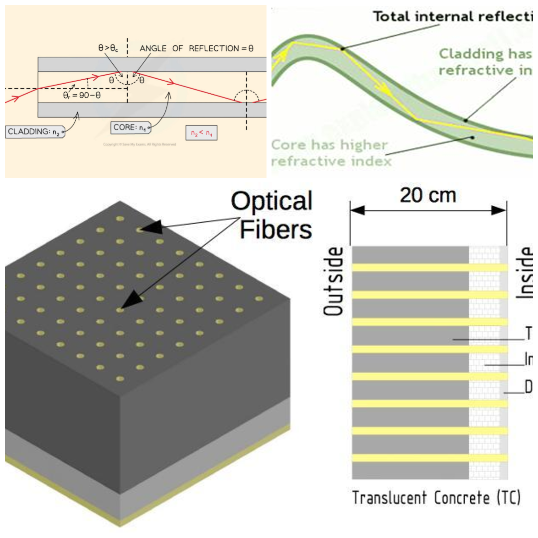 Transparent concrete works on the principle of light transmission through optical fibers, mainly due to internal reflection. As thousands of parallel and straight optical fibers are placed inside the concrete, they are extended from one side to another side of the concrete. When light falls on one side of the concrete, it enters these fibers and travels through them with very little loss. The angle at the incident point is greater than the critical point; that means the light is completely reflected back into the fiber instead of passing out. Although the concrete matrix blocks direct light, the fibers act as continuous light channels that make the material transparent.
